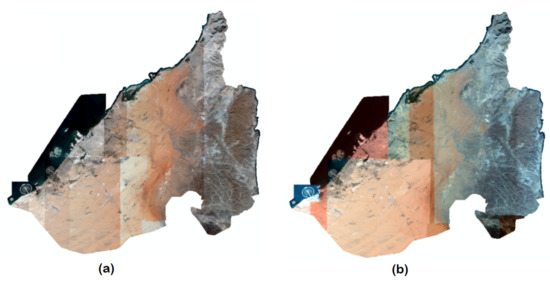 Figure 2a shows the adjacent tiles of the WorldView-2 dataset for the Northern Emirates region in the UAE. The acquisition of tiles is mostly during the summer time in 2014, with some of the tiles acquired in 2015 that led to mosaicking issues. These issues can be clearly observed in