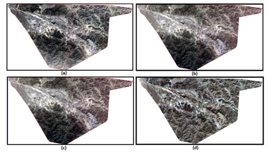 Figure 6a shows the DubaiSat-2 adjacent tiles where the considered leftmost base tile seem to consist of spectral values that are very different from standard surface reflectance. As a result, the obtained color-balanced mosaic is also observed to have spectral values in line with this considered base tile as shown in