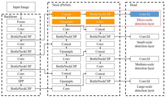 Refined YOLOv5 network structure. The red box is the branch of the microscale detection layer. The microscale detection layer is generated by acquiring lower spatial features and fusing them with high-level semantic features.