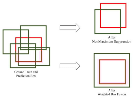 Schematic diagram of nonmaximum suppression (NMS) and weighted boxes fusion (WBF) modified after [47]. Green boxes represent detection boxes, and red boxes represent ground truth boxes.