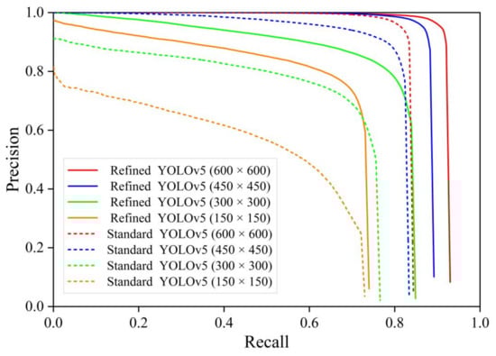 Performance comparison with different resolution images of refined YOLOv5 network and standard YOLOv5 network.