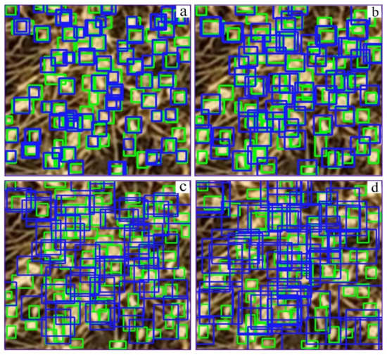 Adding a microscale detection layer and adapting the confidence loss function of the detection layer based on the IoU can realize the small-sized wheat spike detection by concerning small-sized and high-quality positive anchor boxes to the network. For data-driven deep neural networks, there are usually far more negative anchor boxes than positive anchor boxes. Too many negative anchor boxes will cause an imbalance, leading to negative anchor boxes dominating the network’s training [27,50]. The wheat spike sizes in UAV images are generally distributed in 25 to 400 pixels, accounting for about 80% of all spikes (Figure 7). The positive anchor boxes of the standard YOLOv5 concern few small-sized wheat spikes (Figure 8b–d). It means that with the standard three detection layers, the network cannot learn the characteristics of small-sized wheat spikes. In this case, the network will mistake wheat spikes for the background, resulting in many missed detection errors. After adding a microscale detection layer for small-sized wheat spikes, the network acquires more small-sized positive anchor boxes (Figure 8a), which improves the detection accuracy of small-sized wheat spikes. The results of the ablation study test of components of the proposed method with 600 × 600 input images also reveal that adding a microscale detection layer is the most critical improvement (Table 4).