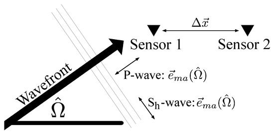 Plane waves from a possible source direction, , arrive at two sensors shown in 2D. The plane wave is described for a given wave type, m, and polarization, A, with polarization vector . This is a simplified 2D example meant to illustrate the notation that we use in Section 2.1; in 3D, two angles are needed to describe the propagation direction, .