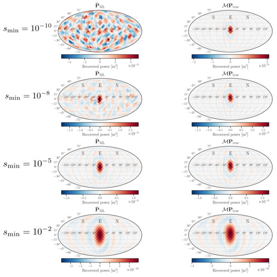 There are many ways of finding approximate solutions to this expression when is not invertible [46,47]. We opt to construct a regularized pseudo-inverse matrix using a singular value decomposition (SVD) [41]. The SVD approach allows us to regularize the inverse matrix by manually setting to zero any singular values that are smaller than some minimum . The choice of is important: small values of will increase the variance of the estimator while large values of will reduce the variance but increase the number of null directions and the spread of a point source on the two-sphere.