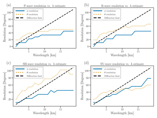 An estimate of the angular resolution for the different components of the seismic field based on (see text) for P, R , and waves (a–d). The resolution is estimated by drawing a contour around the region containing 95% of the total map power and finding the extent in the azimuth () and polar () angle that this contour encompasses. We also show the diffraction limit estimate on each plot.