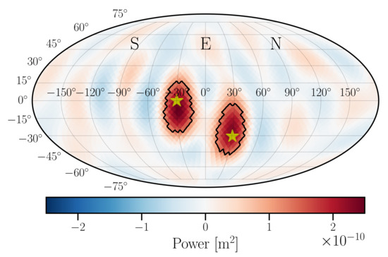 Recovery of two pressure waves is shown, with their true propagation directions indicated by stars. The contours, defined to enclose 95% of the total power, amount to the total recovered power of , as compared to the simulated . This discrepancy is caused by the coherence between the two signals, breaking one of the underlying assumptions of our inversion technique.
