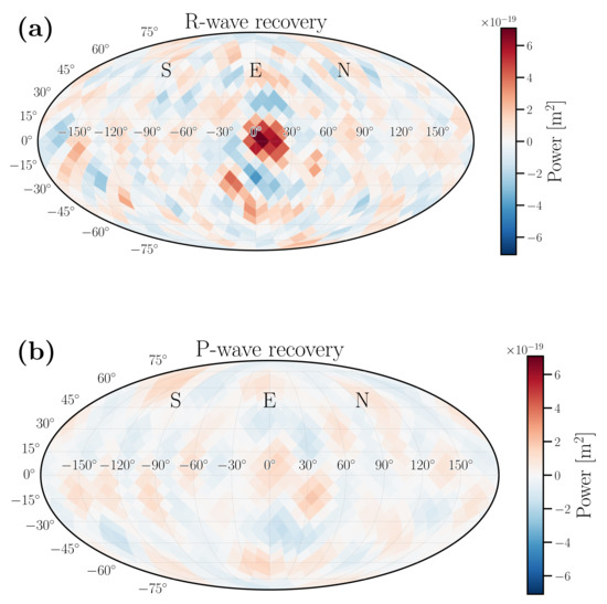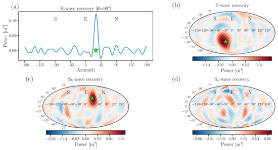 (a–d) R-, P-, -, -wave recoveries. R, P, and S waves are simultaneously simulated with different propagation directions and are successfully recovered (no wave was simulated). The total recovered power is biased: the simulated power was uniform for all three signals, while the total power in the R-wave map was ; for the P-wave map, it is , and for the S-wave map, it is . Adding the power across all four maps yields a total amplitude of , which is larger than what one would expect if all injections were uncorrelated. We assumed , , and .