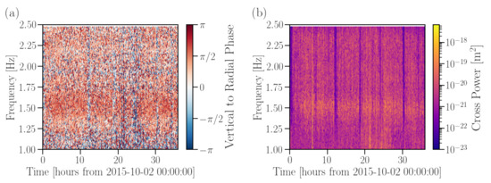 (a) Vertical-to-horizontal phase between the east and the vertical channels of the YATES station is shown for 36 h starting from 2 October 2015. (b) Cross-power between the vertical and east channels of YATES station. The signal at 1.4–1.6 Hz appears at the 1 h mark, and its phase hovers near radians, consistent with the retrograde motion in Rayleigh waves. This signal is clearly a peak in the spectrum, as seen on the right.