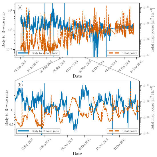 In Figure 8a, we compare the ratio of total recovered power in body waves to recovered power in R waves (blue, solid) to the total power across all recovered maps (orange, dashed) for all available data. Both curves show clear seasonal trends. The total power is larger in winter than in summer, while the opposite is true for the ratio of body to R waves. During the summer, the oceanic microseism is dominated by body waves, while in winter, the contribution of R waves is comparable. In Figure 8b, we show the same as Figure 8a, for only days 100–150 (roughly September through October 2015). There is clear anti-correlation between the total power and the ratio of body waves to R waves, as well as variability on a roughly 7-day timescale. The variability is present in the recovered power for both R waves and body waves, but is more pronounced in R waves than in body waves (leading to the anti-correlation in their ratio shown in Figure 8b). This variability is likely caused by storms or other weather variability that occur on 5–10-day timescales [51]. There is no corresponding trend when comparing the individual S- and P-wave contributions over the course of these data.