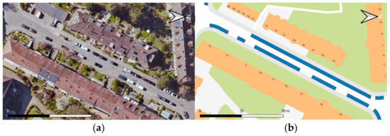 Test site to evaluate the approaches provided in OpenPCDet on our own data. The test road leads through a residential neighborhood in the city of Basel with parking spaces on the left and right side. (a) Aerial image of the test road; (b) map with the parking spaces (blue) (data source: Geodaten Kanton Basel-Stadt).