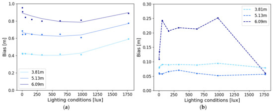 Performance evaluation of depth measurements by D455 (Cam 3): (a) bias and (b) precision in relation to the three measuring distances (light, middle, and dark blue values) and lighting intensity.