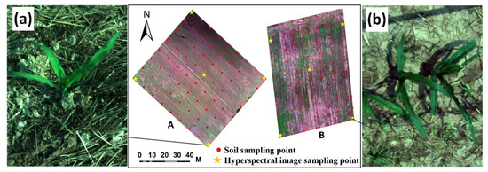 Hyperspectral images were obtained from a SOC710VP portable hyperspectral imager with a spectral range of 400–1000 nm, spectral resolution of 4.68 nm, 128 bands, and the lens type was C-Mount [33]. The hyperspectral image acquisition time was 11:00–15:00, the weather was clear and cloudless, and the wind was light. The SOC710VP was placed on a tripod, and the lens height was 1.6 m. Ten hyperspectral images were collected in the four corners and the center of the two test areas, as shown in Figure 2a,b. At the same time, the gray plate images were collected for correction. The ground range of the acquired images was 60 cm × 80 cm, and the images were processed to realize reflectance conversion.