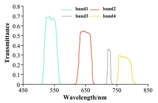 From 11:00–15:00 on 14–15 July 2020, the DJI Matrice 600 Pro six-rotor UAV (SZ DJI Technology Co., Ltd. Shenzhen, Guangdong Province, China) was equipped with a Sequoia multispectral camera (Parrot Sequoia, Parrot Inc., Paris, France) to obtain UAV images. The camera can receive a total of 4 bands of information, which are green light (G), red light (R), red edge (RE) and near infrared (NIR). Its spectral response function was shown in Figure 3. The Sequoia multi-spectral camera was fixed on the UAV gimbal, and the Sunshine sensor which measured the solar irradiance was mounted on the top of the UAV, and the radiation correction data were used to correct the image during the flight [34].