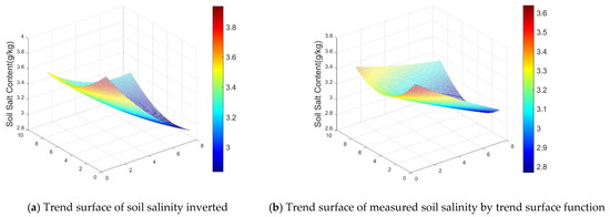 The PLS model based on the fused UAV images was used as the trend surface transformation function, that was F0.05 (B0.05) = 7.375–8.683 × NDVI − 3.083 × DVI + 0.211 × GRVI. Figure 5 and Figure 6 show the comparisons of the secondary trend surfaces of soil salinity obtained from the inversion of trend surface transfer functions and those measured. The results indicate that the spatial distribution trends of soil salinity in the two trend surfaces are basically the same; the trend surface transfer function can well reflect the spatial distribution trend of soil salinity in the study area.