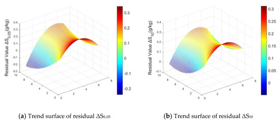The UAV scale conversion residual ΔS0.05 was interpolated and converted to the satellite scale residual ΔS10. Table 5 shows the descriptive statistical features of residuals ΔS0.05 and ΔS10. There were some differences between residuals ΔS0.05 and ΔS10 of different scales. The maximum and standard deviations of ΔS10 were all less than ΔS0.05, and the minimum and average values were all larger than ΔS0.05; the distribution of ΔS10 was concentrated and the dispersion was low. Figure 7 and Figure 8 demonstrate secondary trend surfaces of test area A and B constructed by UAV residuals ΔS0.05 and Sentinel-2A residuals ΔS10, respectively. The spatial distribution structure of residual ΔS0.05 and ΔS10 trend surface was different, but the trend was basically the same.