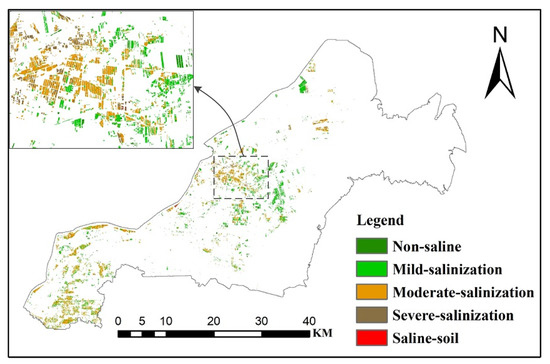 The degree of soil salinization is divided into 5 grades according to soil salinity and relevant criteria [44], non-salinization (<1 g/kg), mild salinization (1–2 g/kg), and moderate salinization (2–4 g/kg), severe salinization (4–6 g/kg) and saline soil (>6 g/kg), and the distribution map of soil salinity grade will be obtained.