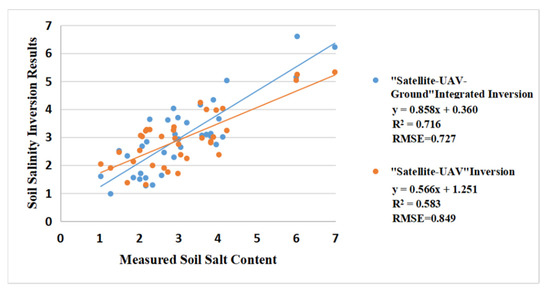 The soil salinity obtained from the satellite-UAV-ground integrated inversion and the satellite-UAV inversion at 37 sampling sites in the Kenli corn planting area were compared with the measured soil salinity to establish the scatter plot—the result is shown in Figure 10. The R2 and RMSE of the satellite-UAV-ground integrated inversion and the measured value were 0.716 and 0.727, respectively, suggesting the inversion results and the measured value were high consistency. Compared with the satellite-UAV inversion, the value of R2 was higher by 0.133 and the value of RMSE was lower by 0.122. Therefore, the consistency between the results of the satellite-UAV-ground integrated inversion and the measured data was higher than that of the satellite-UAV inversion, and the satellite-UAV-ground integrated inversion model had a better accuracy for the large-scale soil salinity inversion.