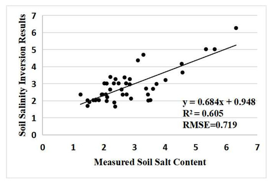The Sentinel-2A image of the corn planting area on 19 July 2019 and the measured soil salt content at 44 ground points were used to verify the universality of the inversion model of corn soil salinity. Figure 11 is a scatter plot of the inversion results of soil salinity in the corn planting area and the measured soil salinity. The result was R2 = 0.605, RMSE = 0.719, indicating that the inversion result had good coherence to the measured soil salinity, and the model could be used as an inversion model of soil salinity in corn seedlings in coastal areas.