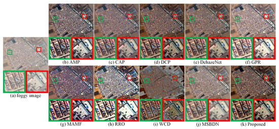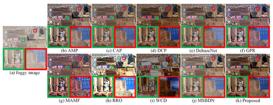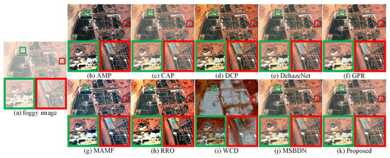 The scene in Figure 9a contains buildings and vehicles. As shown in Figure 9f,g, the overall brightness of the defogged images obtained by GPR and MAMF are relatively high, and the detailed textures shown in the corresponding partially enlarged areas is blurry. As shown in Figure 9j, fog was effectively removed by MSBDN, but the details of the partially enlarged areas are not clear. As shown in Figure 9b, AMP can achieve effective defogging, but the brightness of the local details shown in the partially enlarged areas is low. As shown in Figure 9c,e, the defogged images obtained by CAP and DehazeNet contain a small amount of fog residue, and thin haze still exists under the observation of human eyes. As shown in Figure 9d, DCP can recover the detailed textures of the original foggy image, but the overall brightness of the defogged image is low. As shown in Figure 9h, the defogged image obtained by RRO is over-sharpened. Figure 9i shows that WCD cannot achieve effective defogging. As shown in Figure 9k, the proposed method achieved effective defogging of remote sensing images, and restored clear local detailed textures.