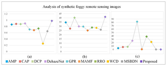 Three objective evaluation indicators, FADE, Entropy and processing time, are used to evaluate the defogging performance of real-world remote sensing images. Table 1 and Figure 11 show the average FADE, Entropy and processing time of 100 groups of comparative experiments. AMP has a high Entropy value, but its FADE value is also high, which means it does not perform well on defogging. DCP, MAMF, RRO, and the proposed method have low FADE values, which means they achieve effective defogging. However, the average processing time of MAMF and RRO is relatively long. According to the ranking of FADE values, the defogging performance of the proposed method is slightly better than the corresponding ones of DCP and RRO. DCP has a high ranking of FADE value, but its Entropy value ranking is low, which means partial image information is lost in the defogging process. MSBDN has a short average processing time, but its rankings of both Entropy and FADE values are low. The results of FADE, Entropy, and average processing time confirm that the proposed method can achieve good defogging performance.