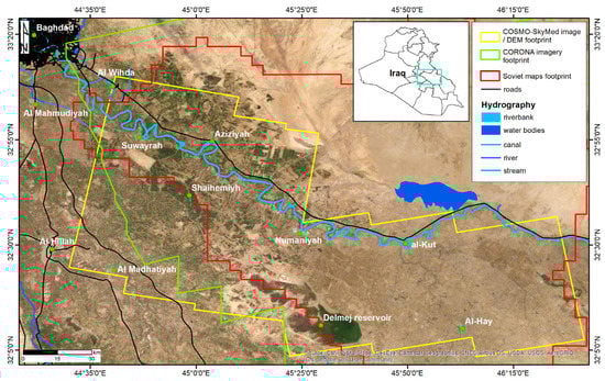 Location of Wasit study area in central Iraq and spatial extent of: the bespoke collection of COSMO-SkyMed StripMap (SM) HIMAGE acquisitions from which the digital elevation model (DEM) was generated; CORONA imagery; and Soviet maps (see Section 2.2, Section 2.3 and Section 2.4, respectively). Iraq roads and waterways from OpenStreetMap.org are displayed onto ArcGIS basemap image.