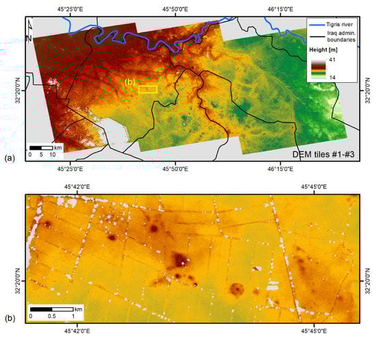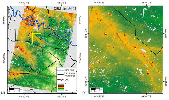 The five COSMO-SkyMed SM DEM products cover a total area of 9000 km2, with elevations above the reference WGS84 ellipsoid ranging between −7.74 and +40.67 m (Figure 4 and Figure 5). The quantity of data gaps due to phase decorrelation span from 3.3% in tile #1 to 23.5% in tile #3 (Table 2), reflecting the land cover and land use and, in particular, the Tigris river course, artificial channels across the large extents of cultivated fields (Figure 4b), and marshes and water bodies (e.g., Delmej marsh).