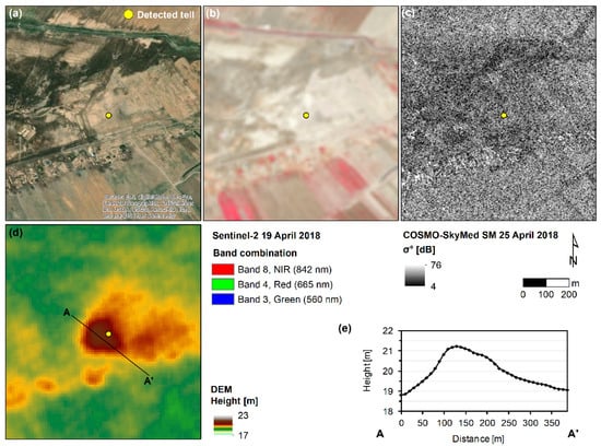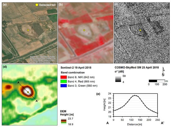 Tell detection through combination of (a) very high resolution (VHR) optical imagery, (b) Sentinel-2 multispectral false-colored composite (R: Band 8—NIR; G: Band 4—red; B: Band 3—green), COSMO-SkyMed (c) SAR radar backscatter image, and (d) DEM with (e) height profile drawn along A-A’ section. Products in (b–d) were all collected in April 2018. Example of clear visibility of a single mound with mud-brick architecture (precise location undisclosed for security concerns). COSMO-SkyMed® Products ©ASI, Italian Space Agency, 2018. All rights reserved. Contains Copernicus Sentinel-2 data, 2018.