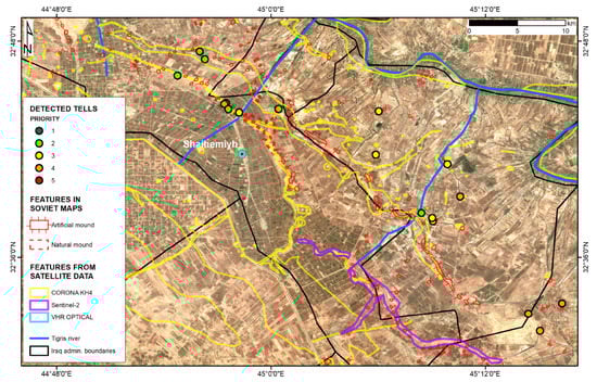 Spatial distribution of tells (indicated by archaeological “priority” score from 1 “very low” to 5 “very high”) in the north-western region of the study area (Al-Zubaidiya and Al-Shehamiya sub-districts, administrative codes IQG18Q04N01 and IQG18Q04N02, respectively) vs. the location of artificial and natural mounds as recorded in historic maps, and paleo-channels mapped from CORONA and more recent satellite data. Contains Copernicus Sentinel-2 data, 2019.