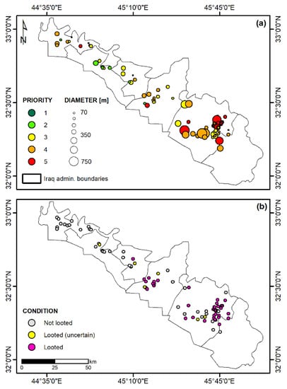 Spatial distribution of mapped tells (a) by priority and their diameter (expressed in meters); and (b) by condition as assessed through visual interpretation of evidence of looting in satellite imagery.