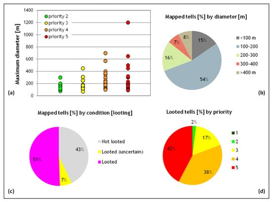 Statistics of the mapped tells by: (a) size (i.e., maximum diameter) vs. archaeological priority, (b) size class, (c) condition (i.e., as assessed through visual interpretation of satellite imagery), and (d) looting evidence vs. archaeological priority.