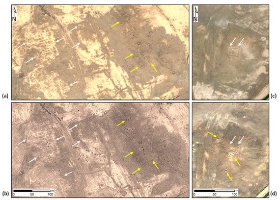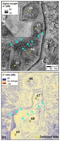 Similar evidence is found on the same date over sites id.66–69 (Figure 15b), with marked patterns along the canals and the narrow roads crossing or running near to the tells (see cyan arrows). However, some differences between the sites are found, with changes of higher magnitude in site id.66 versus 69.