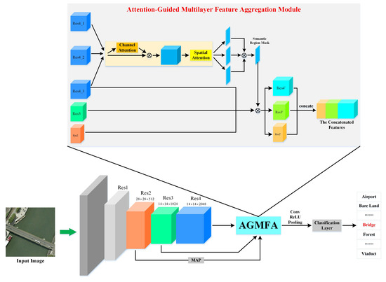 Inspired by this, we propose an attention-guided multilayer feature aggregation network (AGMFA-Net). Specifically, we first extracted multiple convolutional feature maps with different spatial resolutions from the backbone network. Then, the channel–spatial attention was adopted on multiple high-level convolutional feature maps to obtain complete semantic regions that were consistent with the given scene as accurately as possible. Third, in order to integrate the valuable information from different convolutional layers and alleviate the impacts of discrepancies between them, we used the learned semantic regions to guide the multilayer feature aggregation operation. Finally, the aggregated features were fed into the classifier to perform remote sensing scene classification.