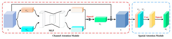 where and concat denote the sigmoid function and concatenation operation, respectively, represents a convolution operation with a filter size of 7 × 7, and AvgPool and MaxPool represent the average pooling and max pooling along the channel dimension. By referring to [55], we connected channel attention and spatial attention in a sequential arrangement manner, which can more effectively focus on important semantic regions of the given scene.