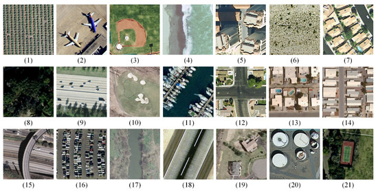 (1) UC Merced Land Use dataset (UCML): The UCML dataset is a classical benchmark for remote sensing scene classification. It consists of 21 different classes of land use images with a pixel resolution of 0.3 m. It contains a total of 2100 remote sensing images with 100 samples for each class. These samples are all annotated from a publicly available aerial image, and the size of each sample is 256 × 256 pixels. The example images of each class are shown in Figure 5.