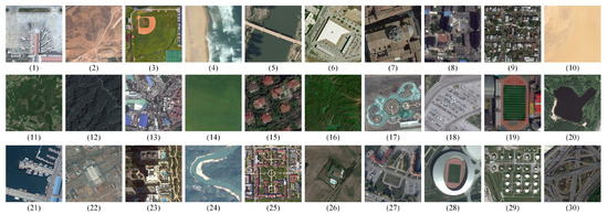 (2) Aerial Image Dataset (AID): The AID dataset has 10,000 remote sensing scene images, which are divided into 30 different land cover categories. Each category’s number varies from 220 to 420. The size of each image is 600 × 600 pixels, and the spatial resolution ranges from about 8 m to 0.5 m. It is noted that the AID dataset is a relatively large-scale remote sensing scene dataset and is challenging for classifying. Some examples of each category are presented in Figure 6.