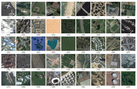(3) NWPU-RESISC45 dataset: This dataset is more complex and challenging compared with the above three datasets. It contains a total of 31,500 images divided into 45 different scenes. Each scene has 700 images with an image size of 256 × 256 pixels. Because of the more diverse scenes, the spatial resolution of the images varies from 0.2 m to 30 m. Figure 7 shows some examples of this dataset.