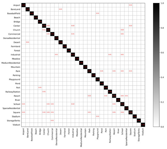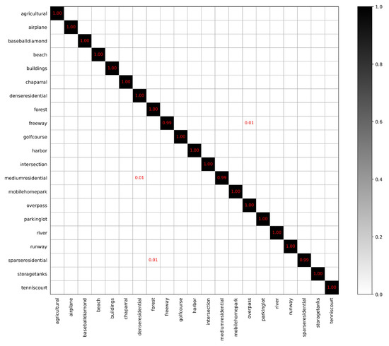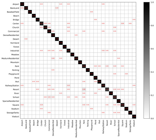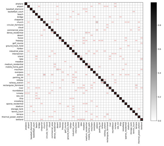 Figure 9 shows the confusion matrix of our proposed method when the training ratio was 80%. It can be seen that almost all scenes can be accurately classified except for some easily confused categories, such as freeway and overpass, medium residential and dense residential, and forest and sparse residential. This is because some scenes are composed of multiple different land use units (e.g., sparse residential contains forest and building together) or show different spatial layout characteristics (e.g., freeway and overpass both contain road, but they have different spatial layouts). These issues make them difficult to classify.
