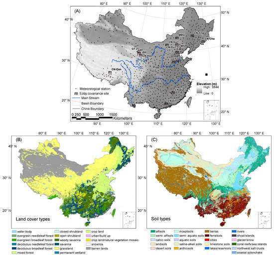 (A) Locations of the study area, 17 eddy covariance sites and 577 meteorological stations. (B) Land cover classification and (C) soil classification from the International Geosphere–Biosphere Programme (IGBP) used in this study.