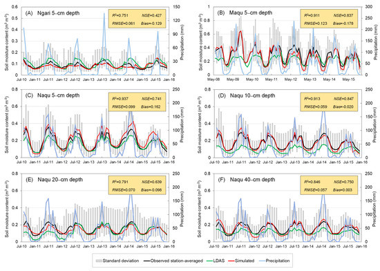 Temporal variability of observed station-averaged soil moisture and its standard deviation, LDAS–derived soil moisture, and reconstructed soil moisture at (A) 5–cm depth in the Ngari network; (B) 5–cm depth in the Maqu network; (C) 5–cm depth in the Naqu network; (D) 10–cm depth in the Naqu network; (E) 20–cm depth in the Naqu network; (F) 40–cm depth in the Naqu network.