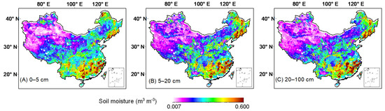 Spatial distribution of the reconstructed (A) 0–5 cm, (B) 5–20 cm, and (C) 20–100 cm soil moisture, respectively averaged over 2003–2015.