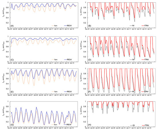 Comparisons of smoothed fsm and relative extractable water (fREW), fM and new soil water availability constraint on transpiration (fTRM) during 2003.1–2015.12 at (A,B) CN–Qia (forest) flux tower, (C,D) CN–Ha2 (shrub) flux tower, (E,F) CN–Du2 (grass) flux tower, and (G,H) YC (crop) flux tower.