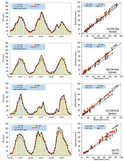 Comparisons of monthly evapotranspiration (ET) from observation, original PT–JPL algorithm (PT–JPL), updated algorithm with soil moisture incorporation into soil evaporation (PT_Es), updated algorithm with soil moisture incorporation into transpiration (PT_T), and updated PT-SM algorithm; and scatter plot of ET model without and with soil moisture incorporation into the updated algorithm at (A) CN–Qia (forest) flux tower, (B) CN–Ha2 (shrub) flux tower, (C) CN–Du2 (grass) flux tower, and (D) YC (crop) flux tower.