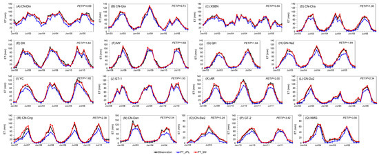 Both the PT-JPL and PT-SM algorithms were executed for in situ evaluation. The in situ modeled ET from both the PT-JPL and PT-SM show good consistency with the observations (Figure 6, Table 3). We noted a site-wide average improvement in R2, NSE, RMSE, and absolute Bias as a result of the model improvements. Sites are ordered from wet to dry (left to right; top to bottom) based on the aridity index (PET/P). The PT-SM algorithm demonstrates greater performance than that of the original PT model at water-limited sites (Table 3). On average, the PT-SM algorithm shows an apparent decrease in RMSE and absolute Bias (36% and 8 mm, respectively), a weak increase in R2 (5%), and a large increase in NSE (20%) when compared with the original PT-JPL model. An interesting feature is that the more overall statistical improvements are observed at CN-Cng and YC sites, two sites that both have relatively dry conditions (PET/P = 2.38 and 1.82, respectively; Figure 6M,I) and a large fraction of ET comes from soil evaporation. It can also be seen that at YC, AR, and CN-Cng sites, the PT-SM model demonstrates considerable improvements to the model estimation of ET during the seasonal dry term (Figure 6).