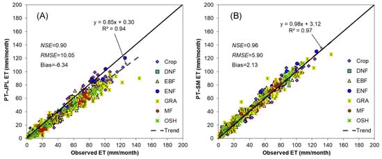 Observed evapotranspiration (ET) at eddy covariance sites vs. (A) PT–JPL ET and (B) PT–SM ET. The solid line is the 1:1 line and the short dashed line is the trend line for ET series of all land cover types of the 17 EC sites.