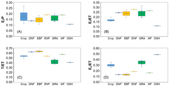 Ratio of (A) canopy interception evaporation to precipitation (Ei/P) varies across different land covers; (B) canopy evaporation to total evapotranspiration (Ei/ET); (C) vegetation transpiration to total evapotranspiration (T/ET); and (D) soil evaporation to total evapotranspiration (Es/ET). Boxes mark the 75th and 25th percentiles and the solid lines and crosses in the boxes refer to the average and median values, respectively.