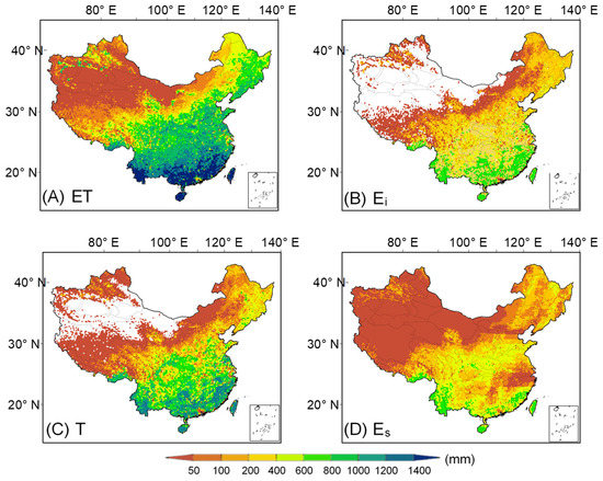 (A) Mean annual PT–SM evapotranspiration (ET); (B) canopy interception evaporation (Ei); (C) vegetation transpiration (T); and (D) soil evaporation (Es) of multiyear (2003–2015) in China.