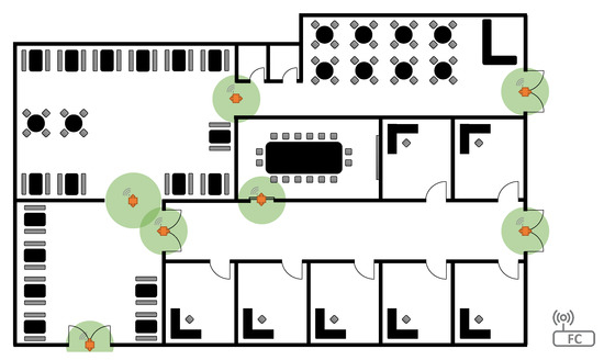 Possible sensor deployment (in orange) and their FoVs (green areas) to monitor occupancy of different zones in a smart building using the proposed method.