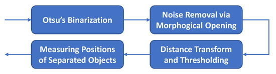 To separate the merged blobs, a Laplacian of Gaussian (LoG) filter is applied on the foreground image. It helps to distinguish passing people who are close to each other [9]. The filtered image is then fed into an object detector. Figure 3 depicts steps of the object detector. After binarization and noise removal, since the boundaries of objects may still touch each other, a distance transformation is applied together with a proper thresholding to have a more clear foreground image. Note that both thresholds, obtained by utilizing Otsu’s method (in binarization) and distance transformation of the binary images, are dynamically updated for each frame. Finally, the central positions of remaining objects in the foreground image are measured and reported.