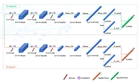 In the CSSVGAN model mentioned above, the Encoder (Figure 4) is composed of a dual-branch spatial feature extraction and a spectral feature extraction to generate more diverse samples. In the module, the size of the 3D convolution kernel is , the stride is and the spectral features are marked as . The implementation details are described in Table 1. Identically, in the module, the 3D convolution kernels, the strides and the spatial features are presented by , and respectively, as described in Table 2.
