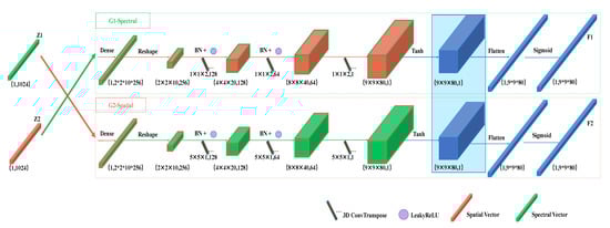 As shown in Figure 5, the 3D convolution of spectral Generator is that uses strides to convert the spatial latent variables to the generated samples. Similarly, the spatial Generator with convolution uses strides to transform the spectral latent variables into generated samples. Therefore, the correlation between spectral and spatial features in HSI can be fully considered to further improve the quality and authenticity of the generated samples. The implementation details of and are described in Table 3 and Table 4.